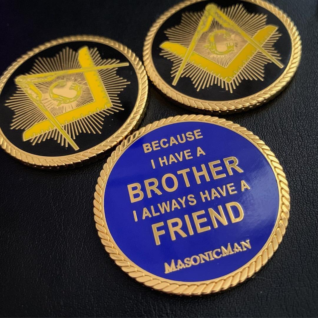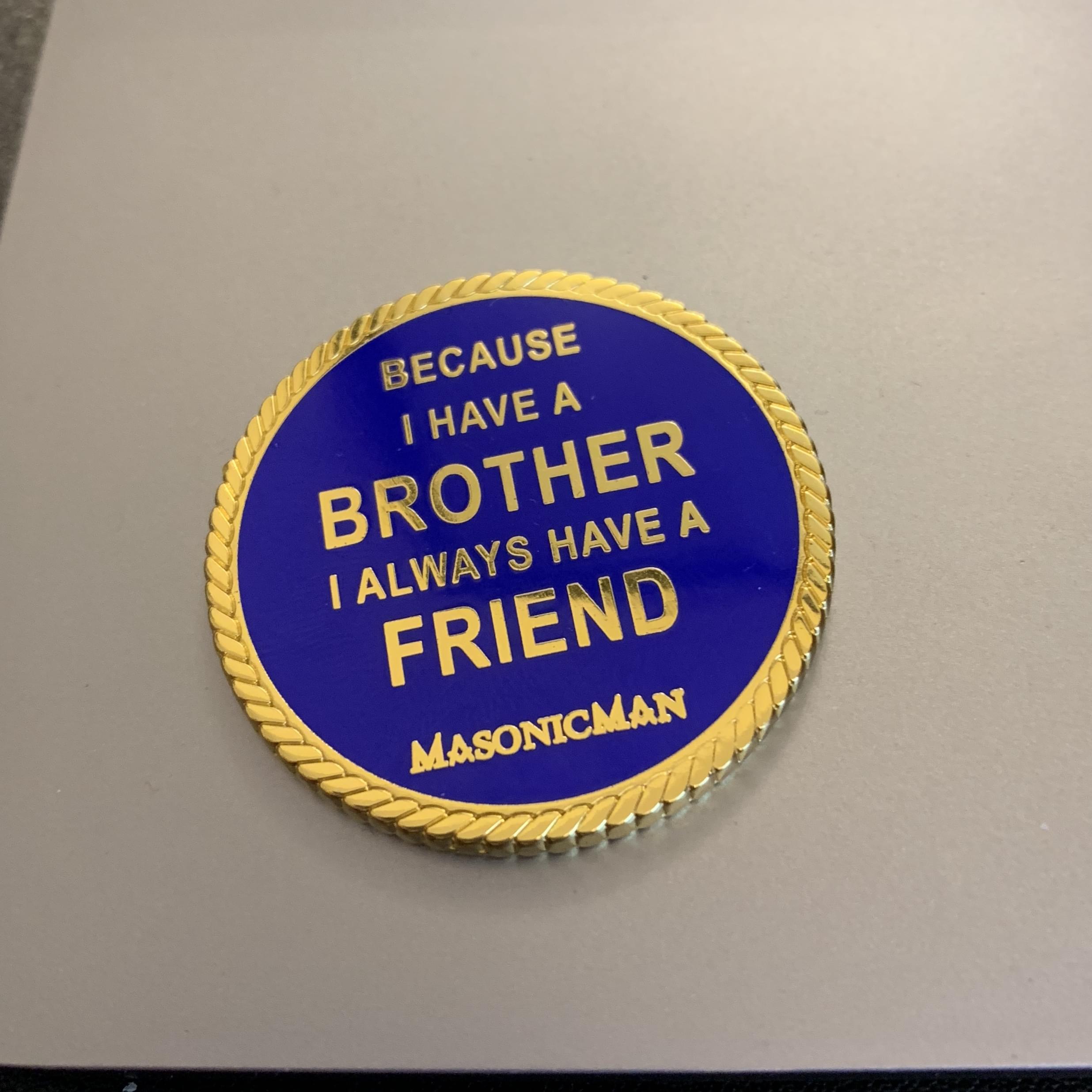 Double Sided. The first side is a classic square and compass in gold on a black background. The other side says "Because I have a Brother I Always Have a Friend"